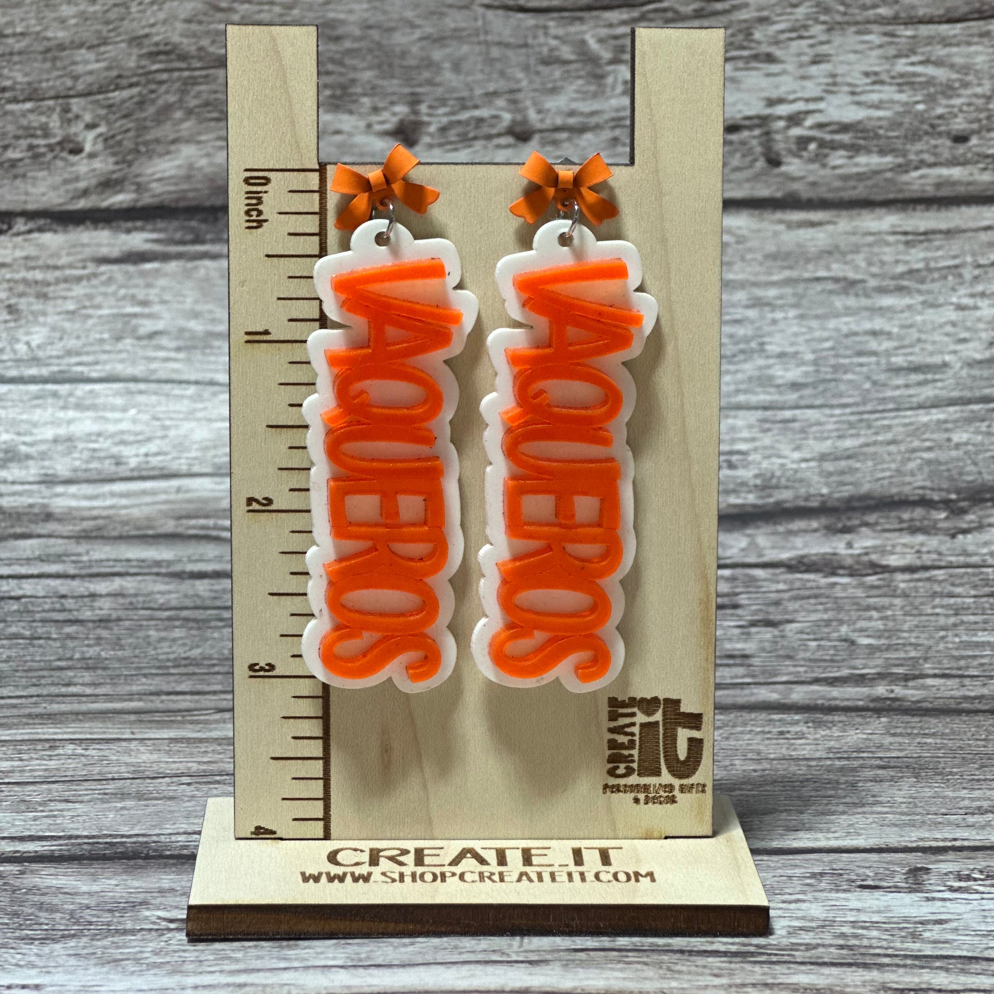 Acrylic madThese acrylic earrings are the perfect accessory for game day! Show off your team spirit with the Vaqueros logo displayed on each earring. Lightweight and comfortable, they are perfect for cheering on your team in style.