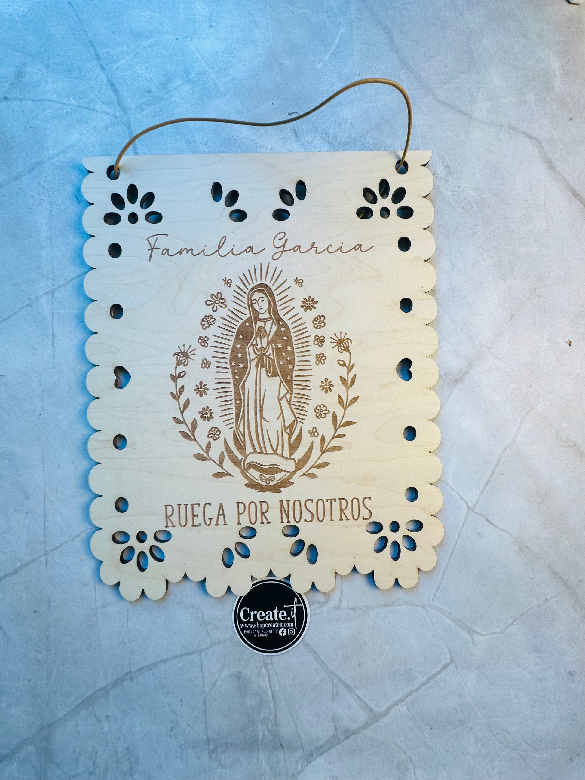 "Adorn your walls with our exquisite Virgin de Guadalupe sign. This 8x10" maple wood sign features a delicate paper picado border and the iconic image of the Virgin de Guadalupe. Ready to hang, it makes for a perfect gift or a sophisticated addition to any room. Order yours now!"